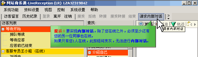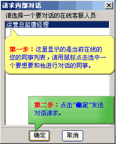 答:您可以和您任何一个在线的同事进行内部对话,与他(她)是否为您的友好对象无关。进行内部对话的方法如(图6、图7、图8)所示: