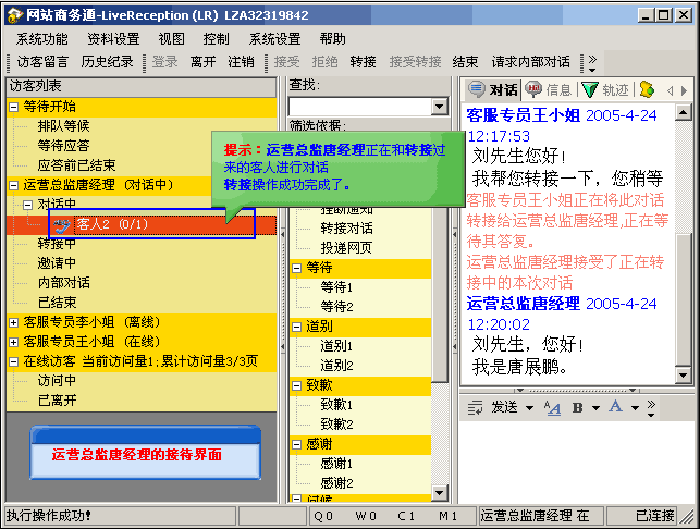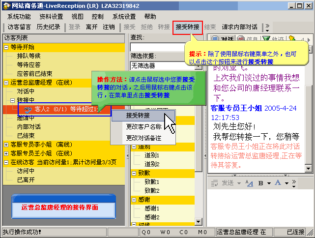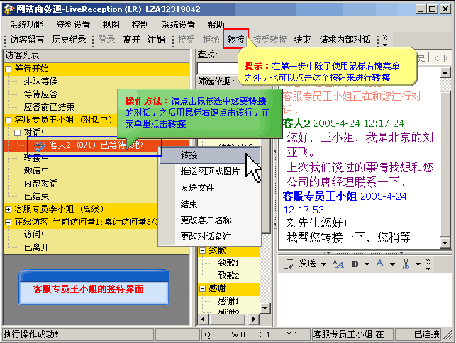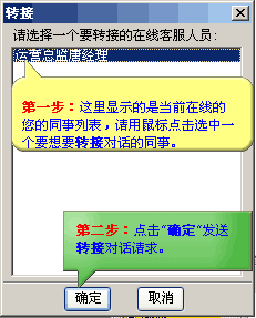 答:如有必要,您可以和您的对话转接给任何一个在线的同事,与他(她)是否为您的友好对象无关。转接对话的方法如(图9、图10、图11、图12)所示: